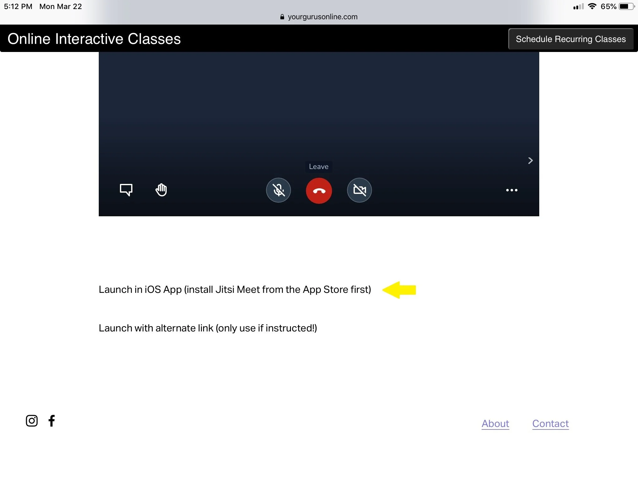 The video will run inside of the mobile browser on Android and iOS mobile devices. If the video is slow or doesn’t display correctly on an old iPhone or iPad, try launching in the mobile app. First, install Jitsi Meet from the Apple App Store then click the link pictured to the left.